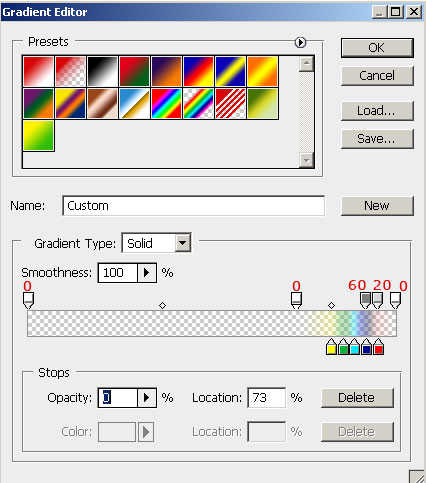 Красными цифрами показаны значения Opacity для определенных участков. У вас может получиться свой градиент, отличный от приведенного.